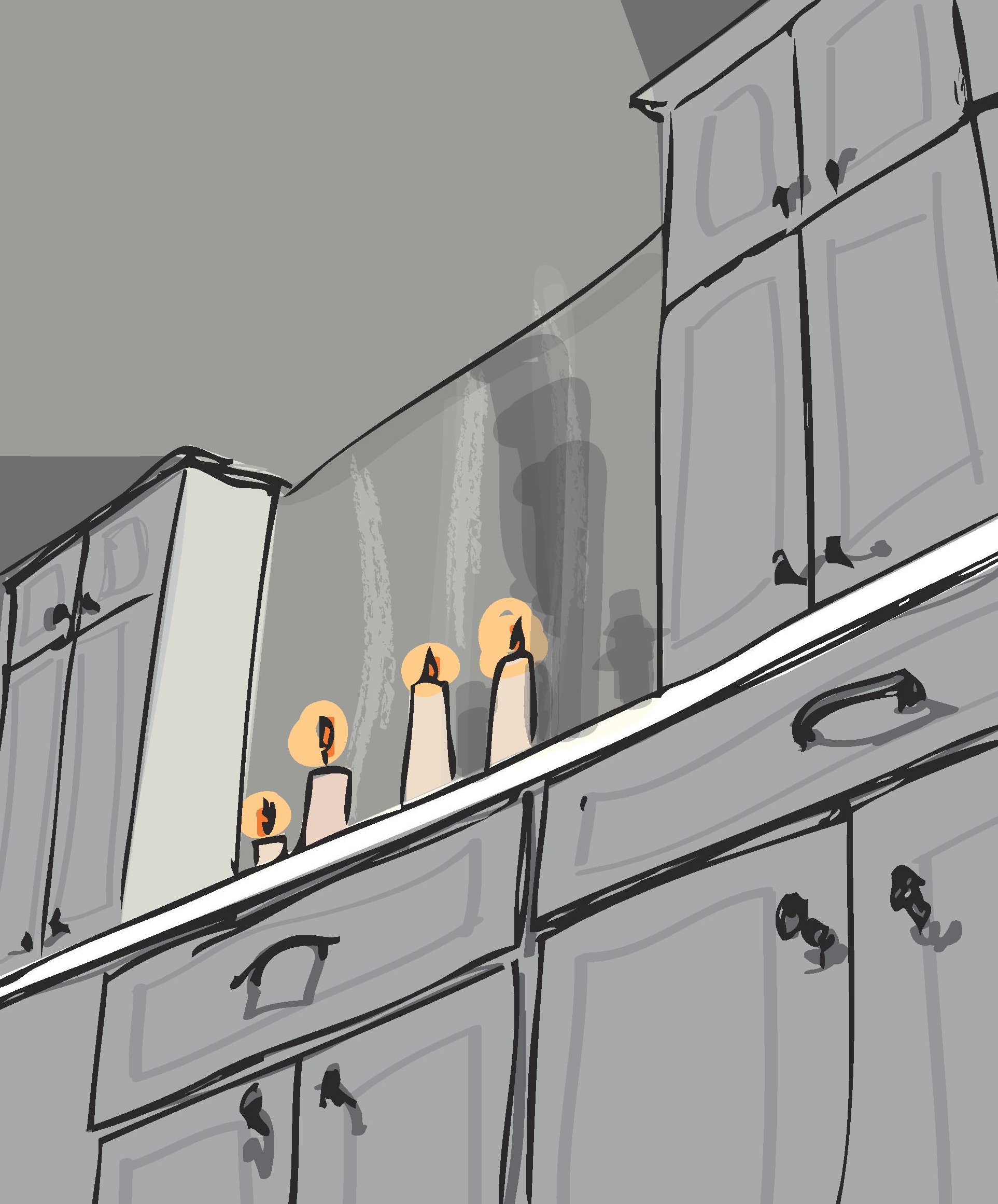 “The Salt Lake City Mormons have a huge geneological library. Any time anyone wants to do family research, it’s the place to go.” The burning wicks make a faint hissing sound in the pause. “Mormons care about the human soul and where it goes. They live for it, they do everything in life for the sake of eternity. So when people who aren’t Mormons die, the Mormons try to get ahold of their names and other such information about them—especially Jewish names—Mormons love Jews—and each Mormon takes on a name.”